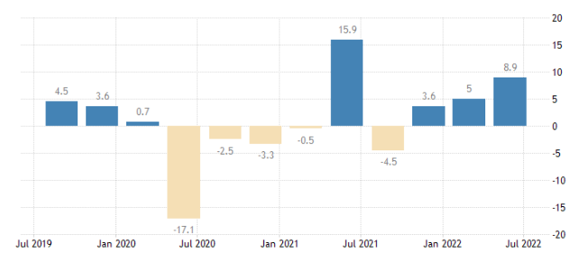 2022 年第二季度歐元區(qū)經(jīng)濟同比增長3.9%,歐盟增長4%,其中葡萄牙同比增長6.9%,增幅在歐盟成員國中位居第二,僅次于斯洛文尼亞(8.3%)。2022年第一季度,葡萄牙經(jīng)濟同比增長11.9%,是歐盟增幅最大的國家。預計2022 年全年經(jīng)濟增長應在 6.4% 至 6.8% 之間。