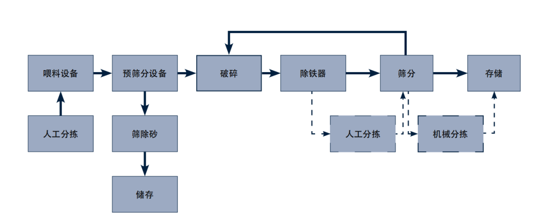 而建筑垃圾本身可以作為砂石骨料生產的半成品直接進行利用,簡單來講,要想將建筑垃圾在建材產業(yè)鏈中變廢為寶,只需做好“篩分+破碎”這兩大工序即可。