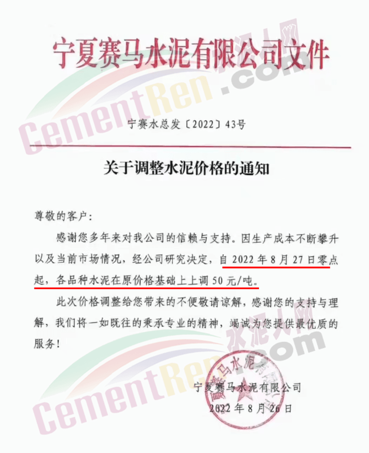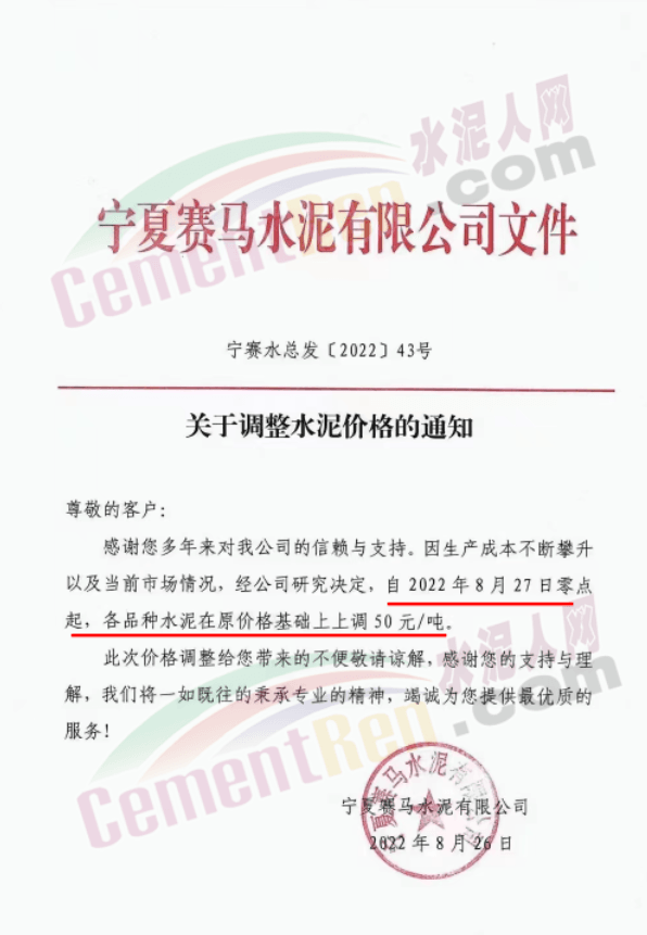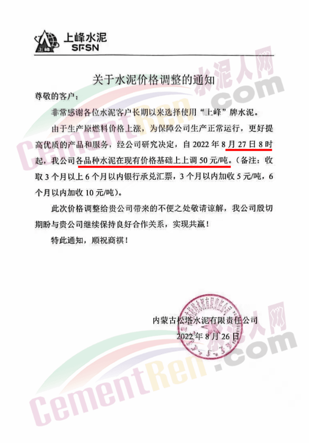 內(nèi)蒙古松塔水泥通知,8月27日8時(shí)起各品種水泥價(jià)格上調(diào)50元/噸。