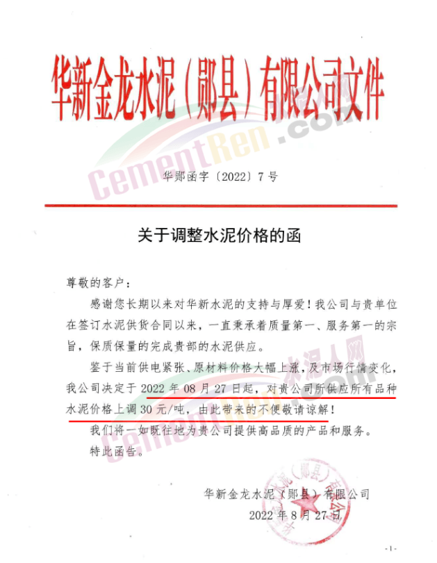位于湖北省十堰市的華新金龍水泥(鄖縣)公司通知,鑒于當(dāng)前供電緊張、原材料價(jià)格大幅上漲,及市場(chǎng)行情變化,公司決定于2022年08月27日起,對(duì)所有品種水泥價(jià)格上調(diào)30元/噸。