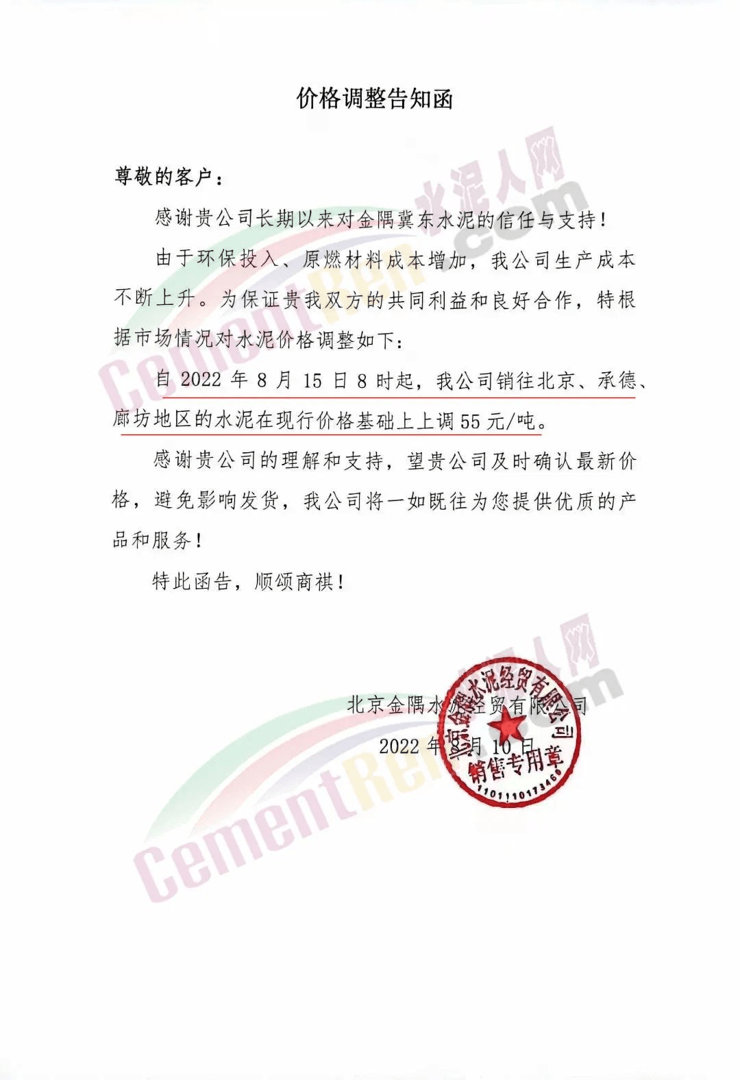 水泥人網(wǎng)通訊員消息:日前北京金隅經(jīng)貿(mào)公司通知,由于環(huán)保投入、原燃材料成本增加,公司生產(chǎn)成本不斷上升。自2022年9月1日8時起,銷往承德地區(qū)的水泥在現(xiàn)行價格基礎(chǔ)上上調(diào)130元/噸。