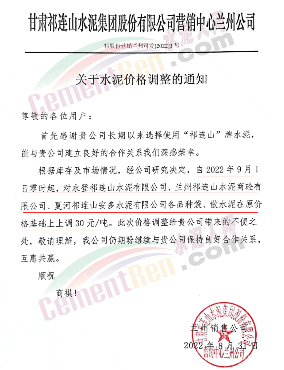 京蘭水泥通知,自2022年9月1日零時起對榆中、金和、蘭州、臨洮、臨夏區(qū)域所有品種水泥在原價基礎(chǔ)上上漲30元/噸。
