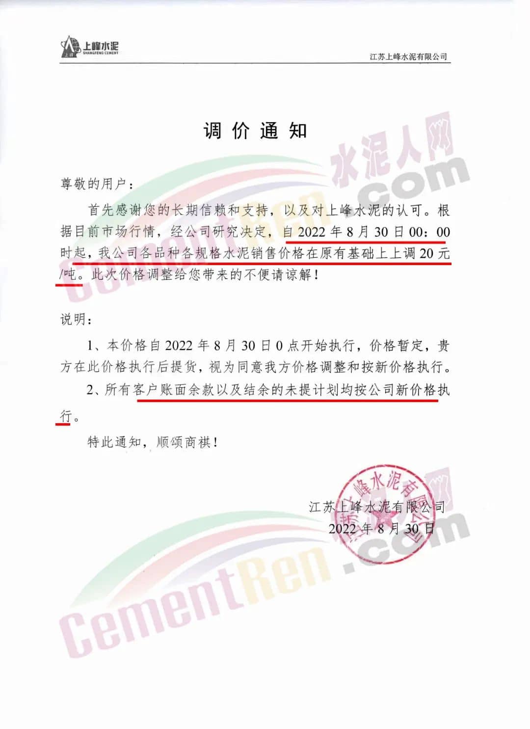 江蘇上峰水泥通知,8月30日0時起,各品種各規(guī)格水泥上調(diào)20元/噸,且所有客戶賬面余款以及結(jié)余的未提計劃均按公司新價格執(zhí)行。
