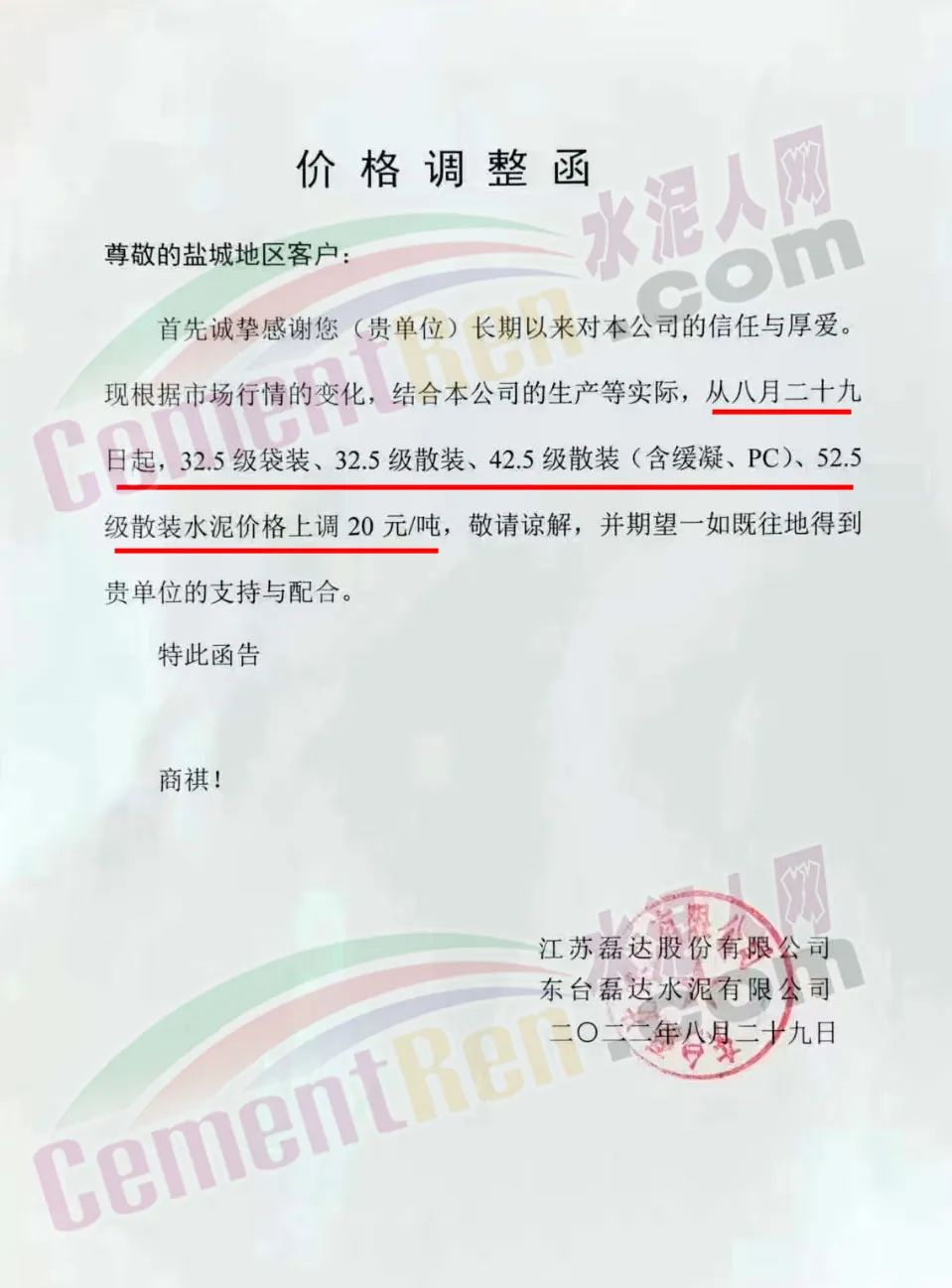 江蘇磊達水泥通知,8月29日起各標號水泥上調(diào)20元/噸。