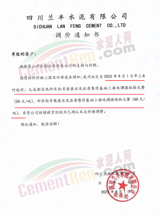 與此同時,四川亞東水泥、四川蘭豐水泥等水泥企業(yè)通知因原材料價格上漲及環(huán)保成本增加,自2022年9月1日早上8時起,大成都區(qū)域所有標號袋裝水泥在原售價基礎(chǔ)上上調(diào)50元/噸,所有標號散裝水泥在原售價基礎(chǔ)上調(diào)60元/噸。
