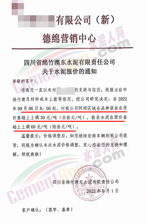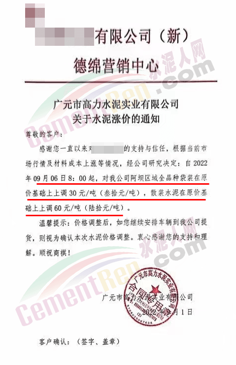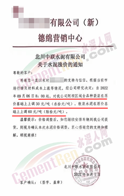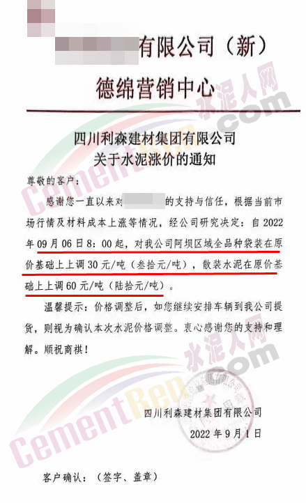甘肅永固特種水泥有限公司通知因疫情影響等諸多原因,成本大幅上升。經(jīng)公司研究決定,自9月1日零時起,各型號水泥在原價基礎(chǔ)上上調(diào)30元/噸。