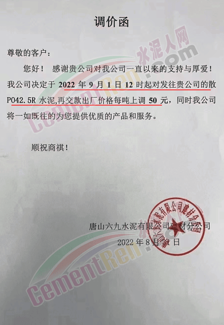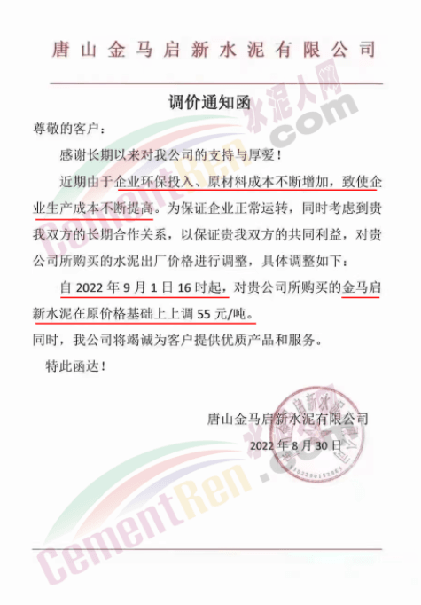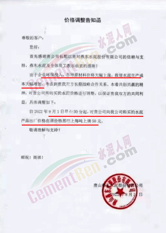 唐山冀東、泓泰、六九、圣龍、金馬啟新、京東、天津山水、秦皇島武山等水泥企業(yè)通知由于環(huán)保投入、各種原材料價格大幅上漲,致使水泥生產(chǎn)成本大幅增加。水泥價格自9月1日起上調(diào)50元/噸。這是繼8月份以來的第二次漲價,也是9月的第一輪上漲。部分企業(yè)累計上漲已達(dá)100元/噸以上。