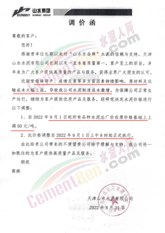 日前,太原金隅冀東水泥經(jīng)貿(mào)有限公司通知,因近期原材料價格持續(xù)上漲、環(huán)保投入加大、能耗雙控及錯峰生產(chǎn)等因素,造成公司生產(chǎn)成本增加。根據(jù)當(dāng)前市場情況,自9月1日8時起晉陜區(qū)域各品種水泥在現(xiàn)行價格基礎(chǔ)上上調(diào)50元/噸。