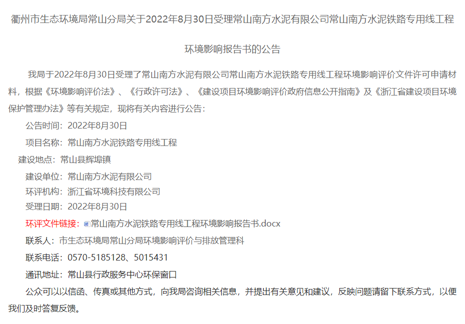 浙江省衢州市生態(tài)環(huán)境局常山分局發(fā)布《關(guān)于2022年8月30日受理常山南方水泥有限公司常山南方水泥鐵路專用線工程環(huán)境影響報(bào)告書的公告》