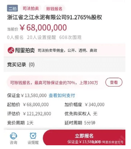 2021年9月24日在阿里拍賣平臺(tái)上,由浙江省金華市中級(jí)人民法院處置的杭州黑社會(huì)組織“骨干”王觀成名下浙江省之江水泥有限公司91.2765%股份公開拍賣。記者從拍賣平臺(tái)獲悉,王觀成所涉案件位列近年浙江省掃黑除惡案例榜首,他和首要分子虞關(guān)榮、戴國松一審均被判無期徒刑,并處沒收個(gè)人全部財(cái)產(chǎn)。