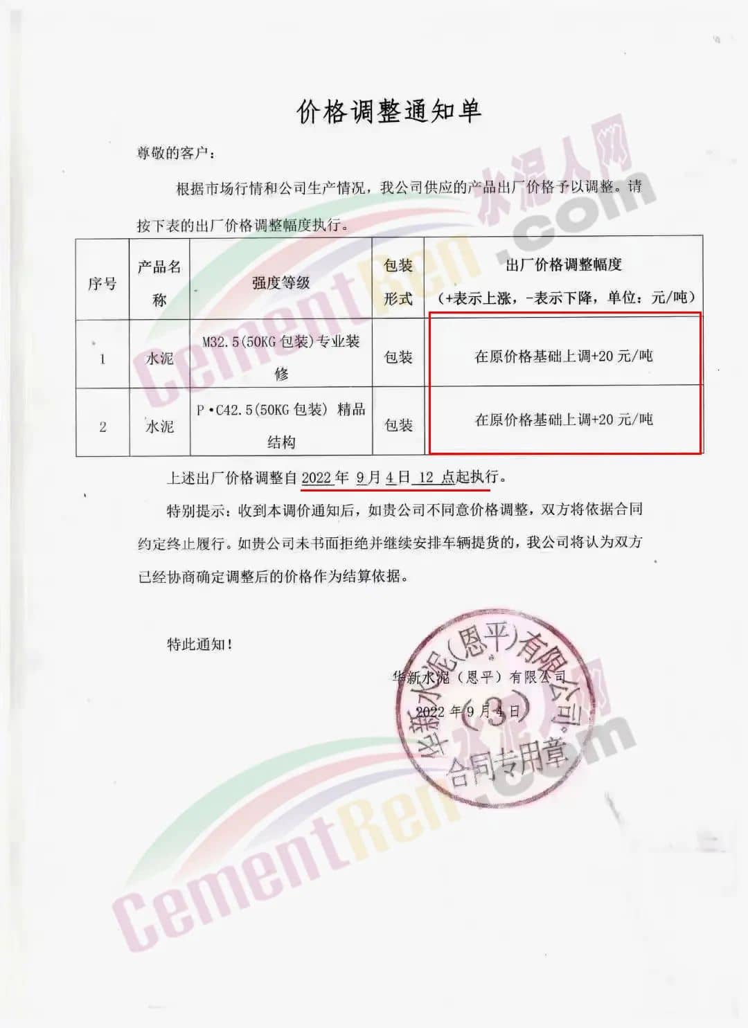 石門海螺銷售處通知,因市場(chǎng)行情變化,自9月4日8時(shí)開(kāi)始對(duì)各區(qū)域所有品種水泥價(jià)格上調(diào)20元/噸。