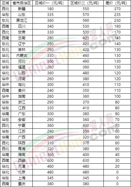 吉林、浙江、安徽、江蘇、云南、遼寧、福建、河南、湖南、廣西、貴州、新疆等12個(gè)地區(qū)區(qū)域一價(jià)格在300元/噸以下;重慶、黑龍江、河北、山西、寧夏、四川、山東、甘肅、內(nèi)蒙古、江西、青海、陜西等28個(gè)省市自治區(qū)均價(jià)在國(guó)家統(tǒng)計(jì)局公布的流通領(lǐng)域報(bào)價(jià)384.3元/噸以下。