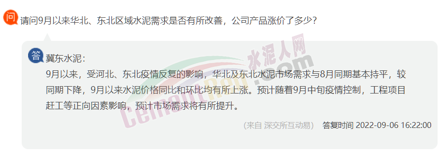 另有投資者提問(wèn),9月以來(lái)華北、東北區(qū)域水泥需求是否有所改善,公司產(chǎn)品漲價(jià)了多少?冀東水泥回復(fù)稱,9月以來(lái),受河北、東北疫情反復(fù)的影響,華北及東北水泥市場(chǎng)需求與8月同期基本持平,較同期下降,9月以來(lái)水泥價(jià)格同比和環(huán)比均有所上漲。