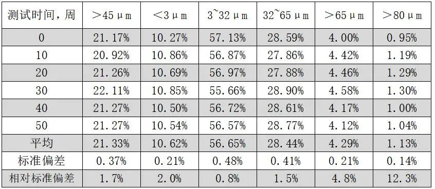 長時間連續(xù)的工作,對在線系統(tǒng)的防污染及自清潔能力提出了很高的要求,歐美克在線系統(tǒng)通過風(fēng)刀反向增壓紊流自動清洗技術(shù)顯著延長了系統(tǒng)的免人工維護(hù)時間。相較于傳統(tǒng)順序壓力梯度清洗方式,歐美克在線系統(tǒng)的窗口自潔能力得到了極大地提高,顯著地降低了人工手動清洗測試窗口的頻度,同時保障了測試結(jié)果始終可靠!以某品牌的PO42.5水泥樣品為例,在風(fēng)刀自動清洗維護(hù)下,系統(tǒng)無人干預(yù)連續(xù)工作3個月以上,45um余量、3-32um含量、32-65um含量、小于3um含量皆能保持良好的重現(xiàn)性,且無趨勢性偏移。在此案例中,無人干預(yù)連續(xù)工作超過3個月,以上含量連續(xù)監(jiān)控相對標(biāo)準(zhǔn)偏差均在2%以內(nèi)。