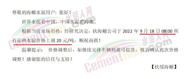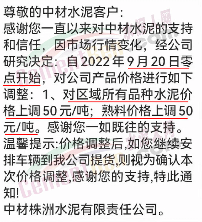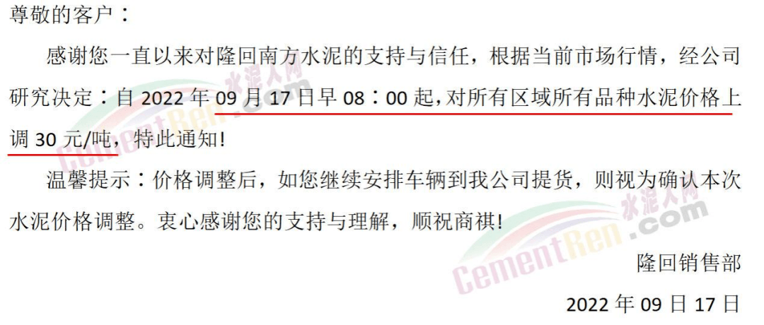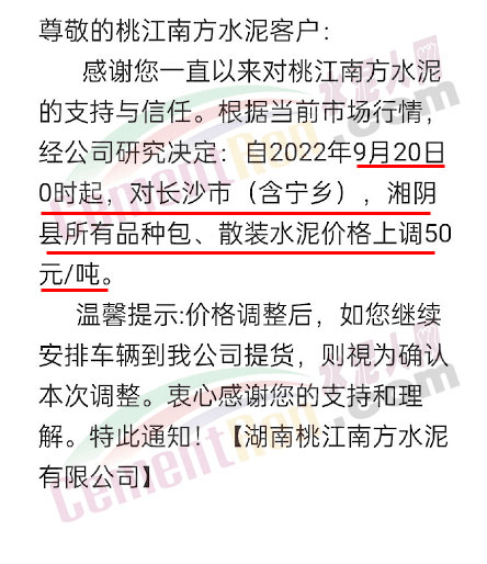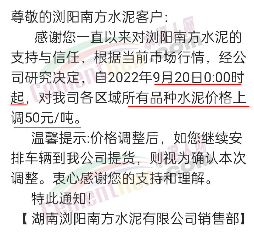 湖南寧鄉(xiāng)南方水泥有限公司銷售部通知根據(jù)當(dāng)前市場行情及原材料成本上漲等情況,經(jīng)公司研究決定自2022 年9月20日0時(shí)起,對各區(qū)域、各品種的水泥出廠價(jià)在原基礎(chǔ)上整體上調(diào)50元/噸。