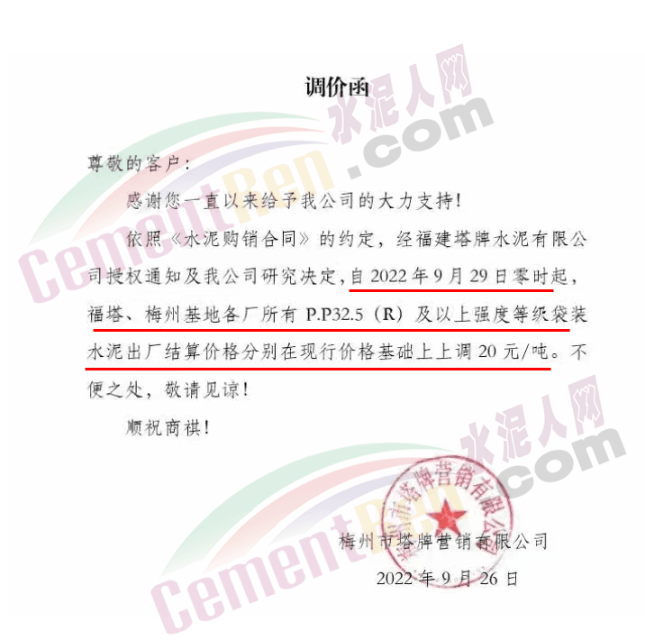 梅州市塔牌營銷有限公司自2022年9月29日零時起,福塔、梅州基地各廠所有PP325(R)及以上強度等級袋裝水泥出廠結(jié)算價格分別在現(xiàn)行價格基礎(chǔ)上上調(diào)20元/噸。