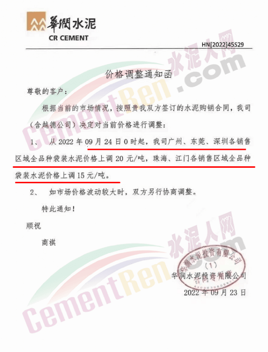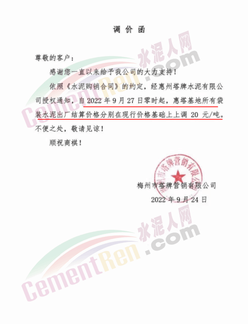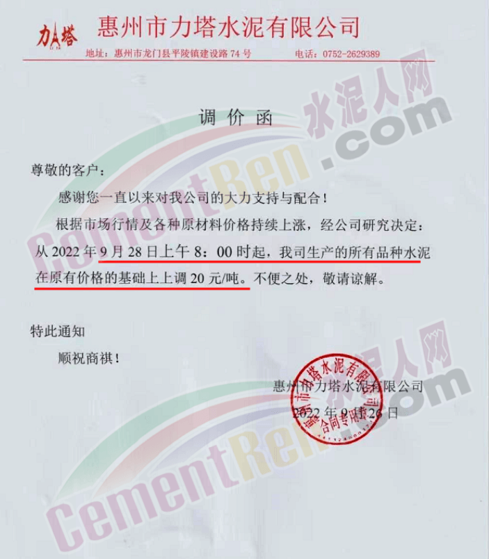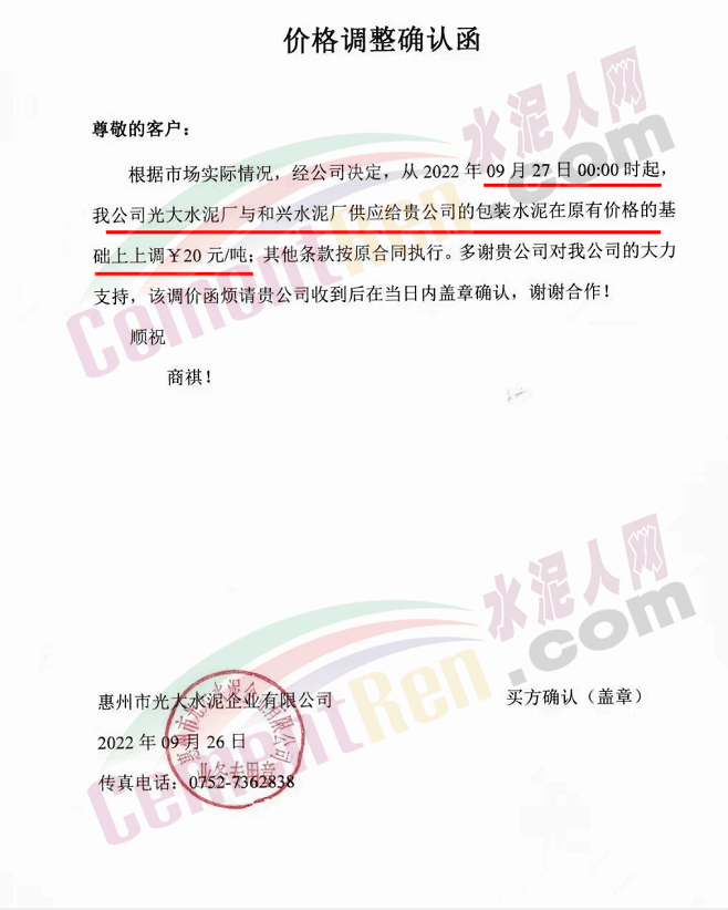 惠州市光大水泥企業(yè)有限公司通知,自9月27日0時起,水泥價格上調(diào)20元/噸。