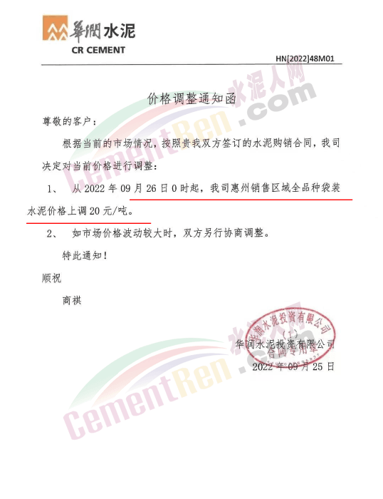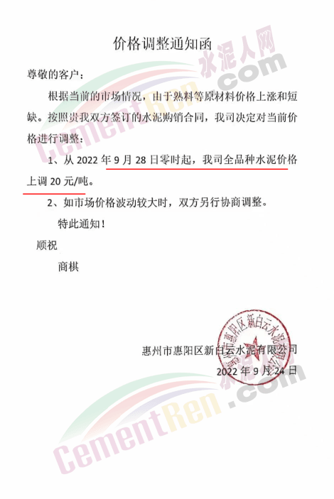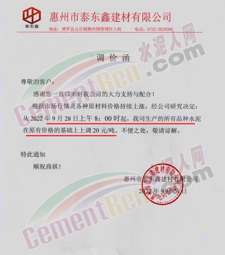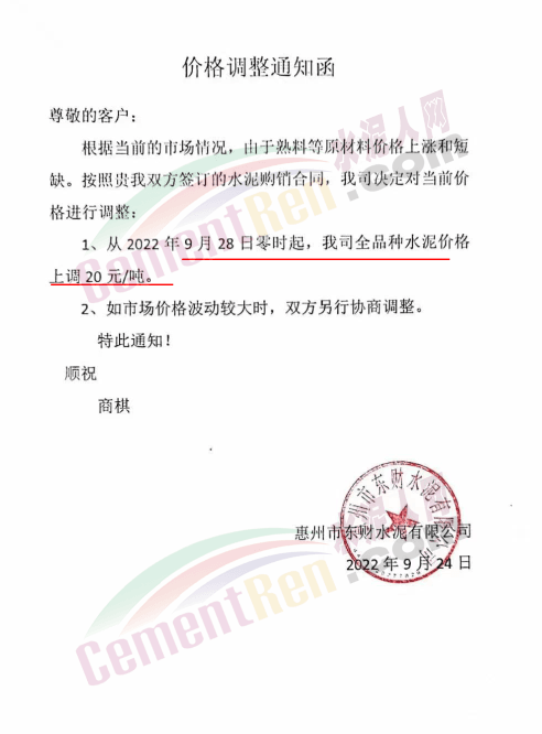 惠州市東財水泥通知,9月28日零時起,上調(diào)水泥價格20元/噸。