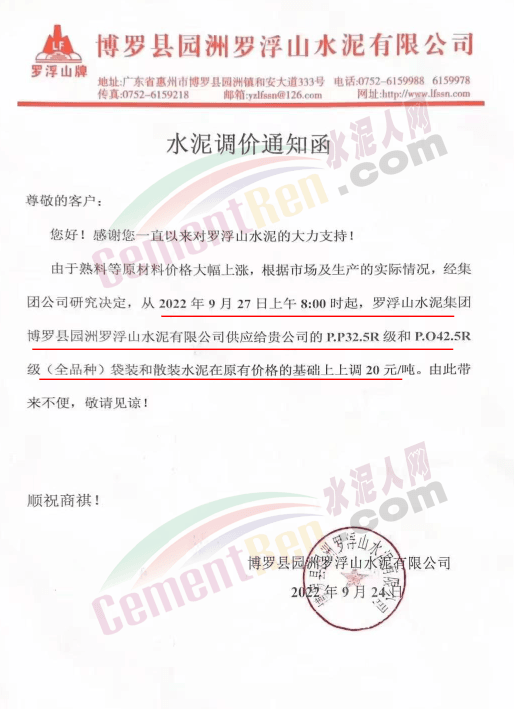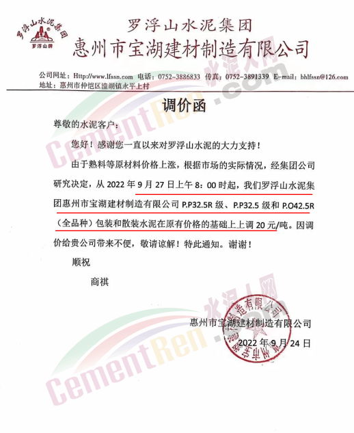 博羅縣園洲羅浮山水泥通知,9月27日8時起,水泥價格上調(diào)20元/噸。
