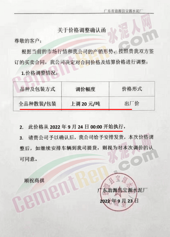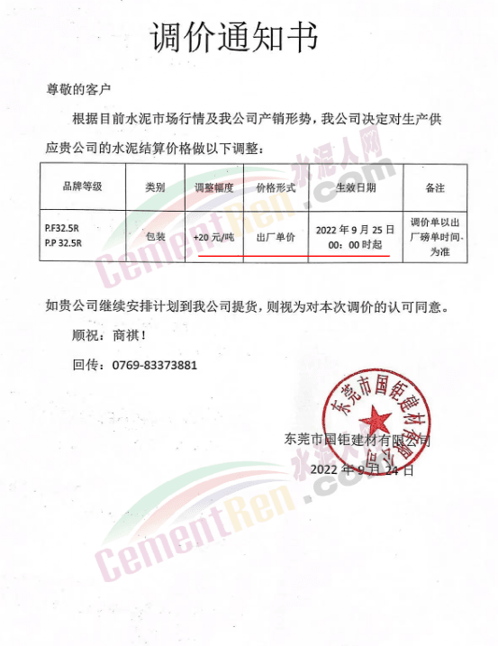 東莞市國鉅建材有限公司通知,9月25日0時起上調(diào)水泥價格20元/噸。