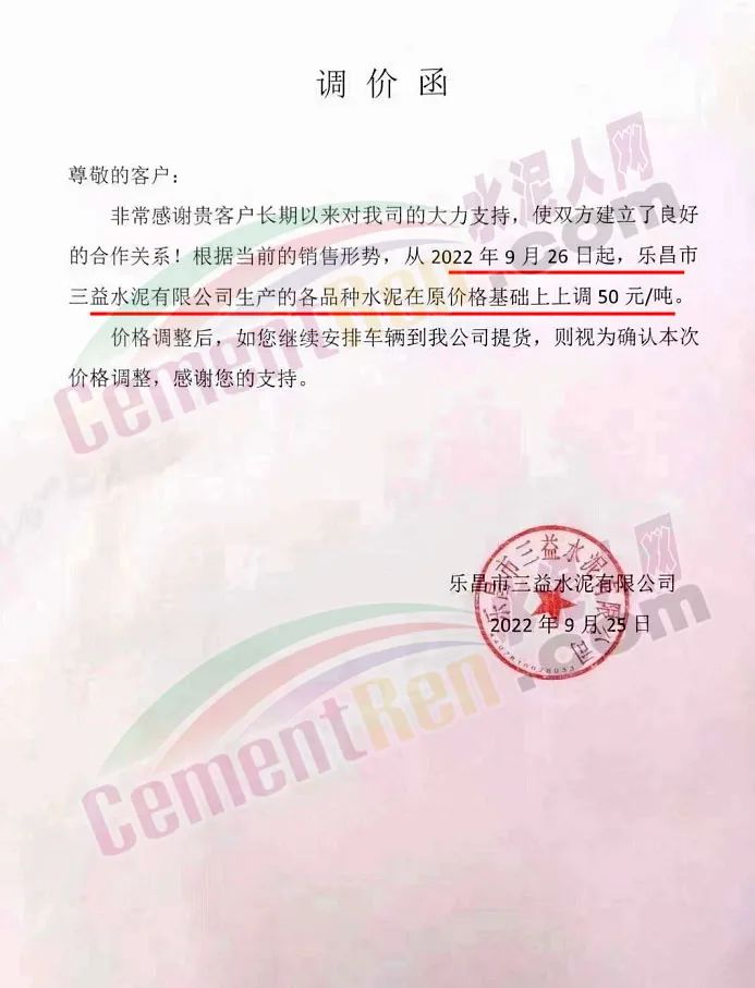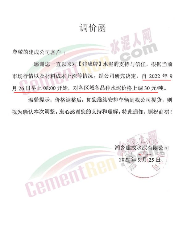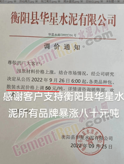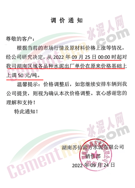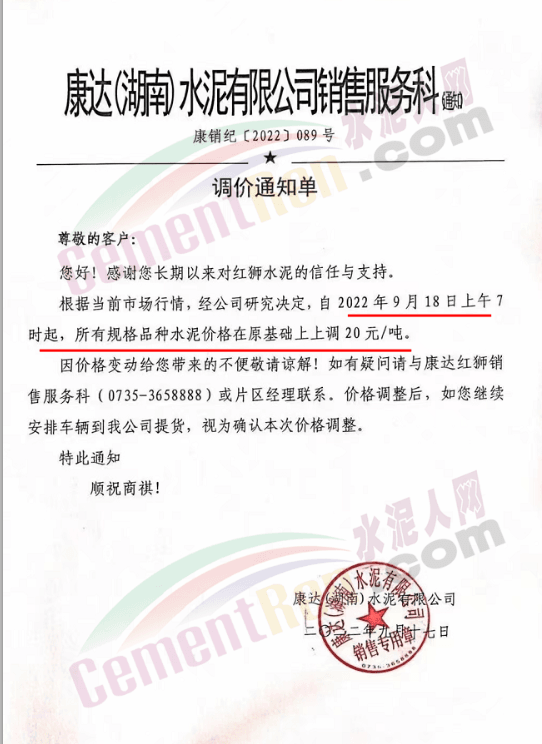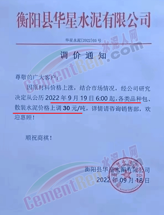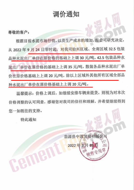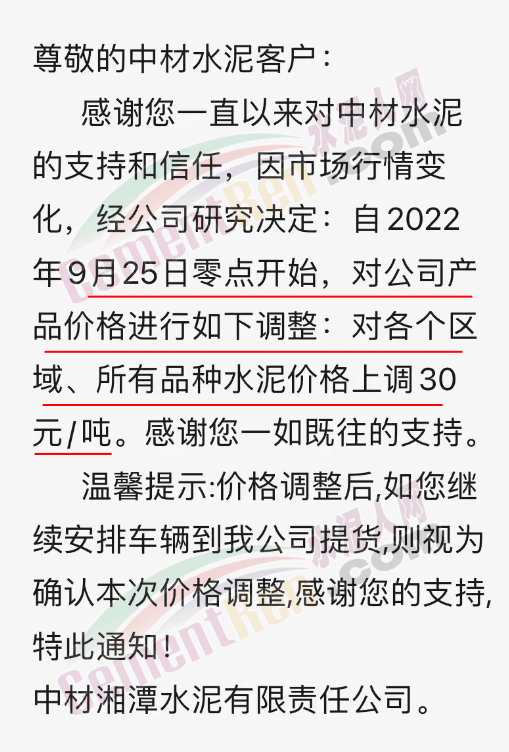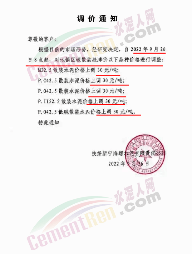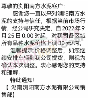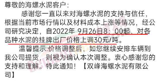 雙峰海螺水泥通知自2022年 9月26日8:00起,對各品種水泥的掛牌出廠價格上調(diào)30元/噸。