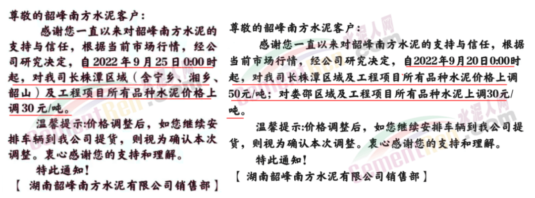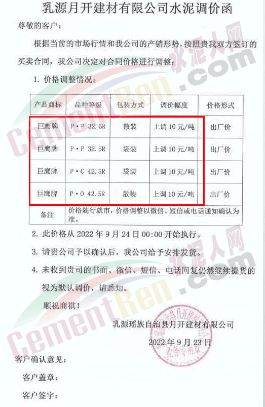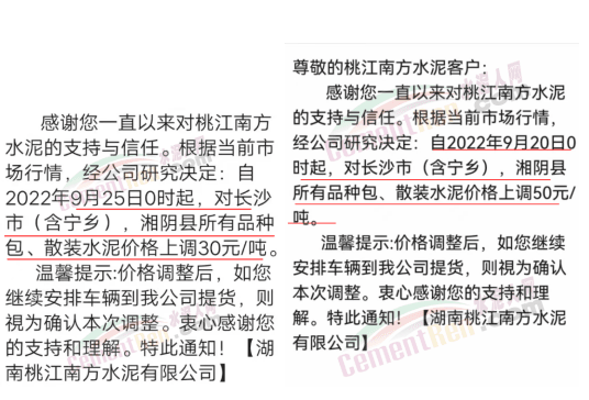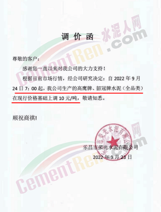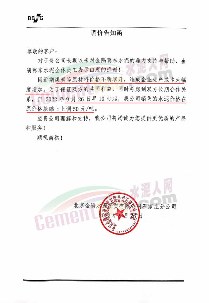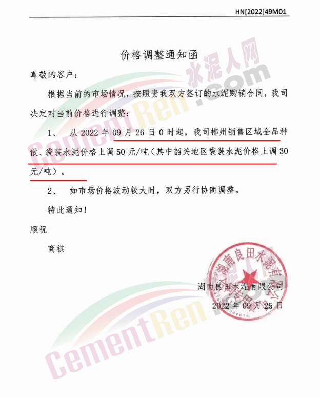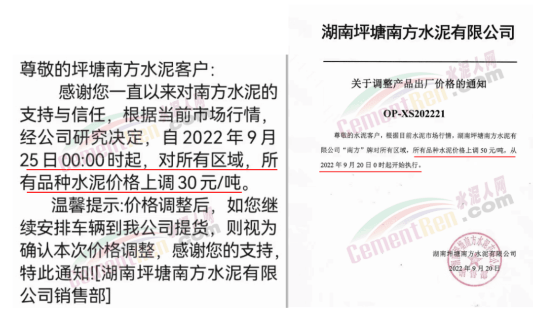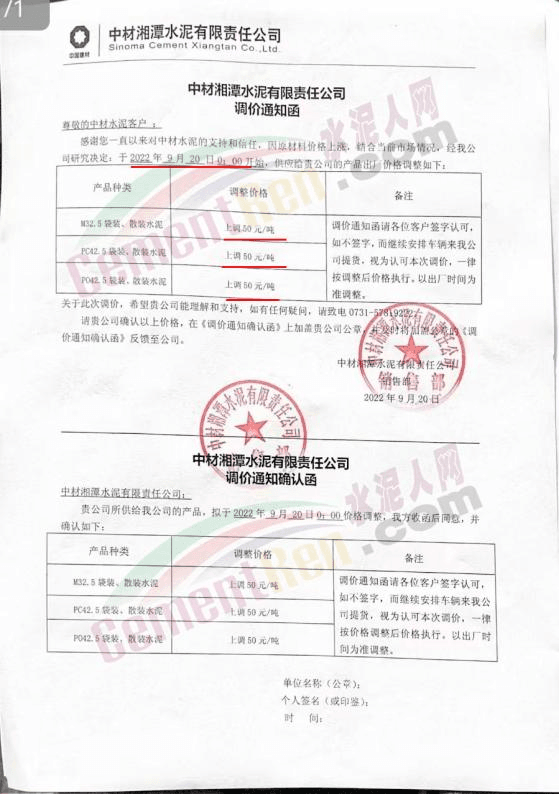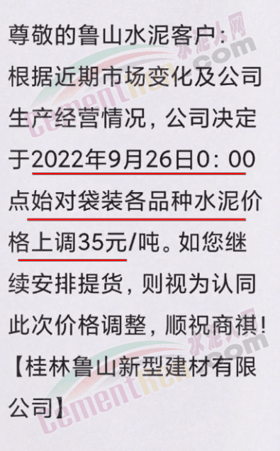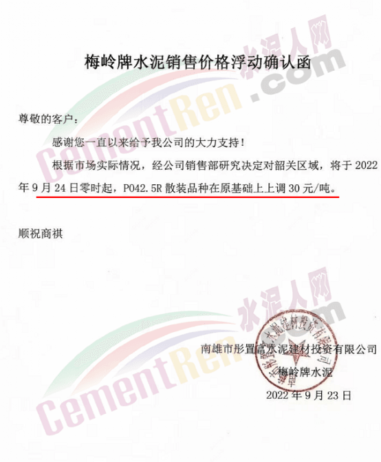 雙峰海螺水泥通知自2022年 9月26日8:00起,對各品種水泥的掛牌出廠價格上調(diào)30元/噸。