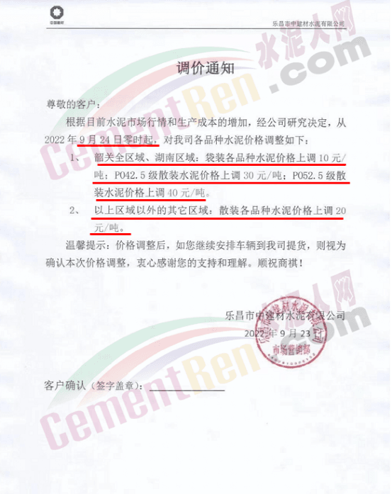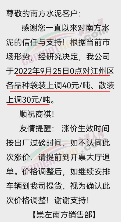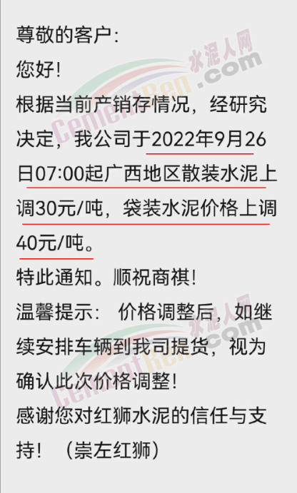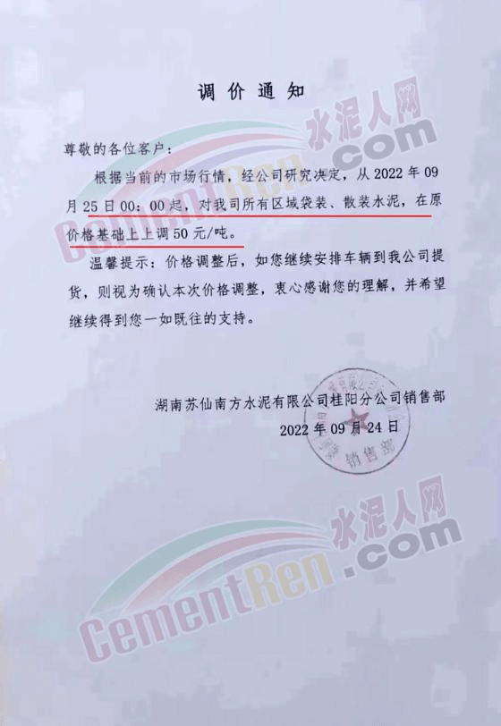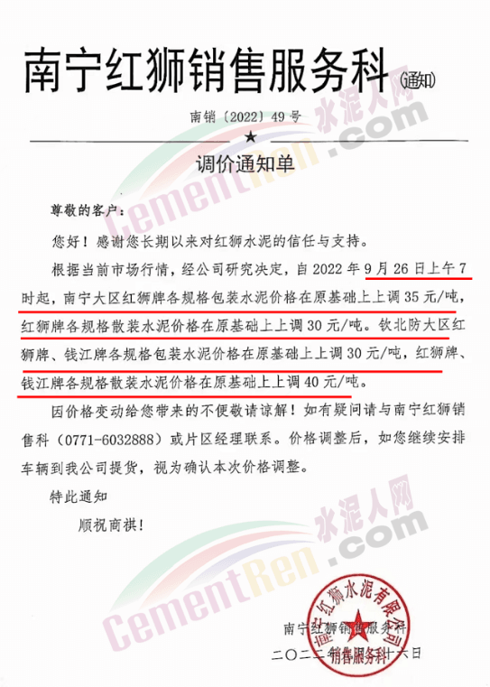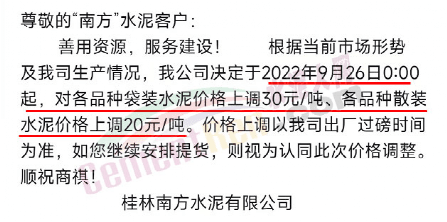 桂林南方水泥有限公司通知, 根據(jù)當前市場形勢及我司生產(chǎn)情況,公司決定于2022年9月26日0:00起,對各品種袋裝水泥價格上調(diào)30元/噸、各品種散裝水泥價格上調(diào)20元/噸。