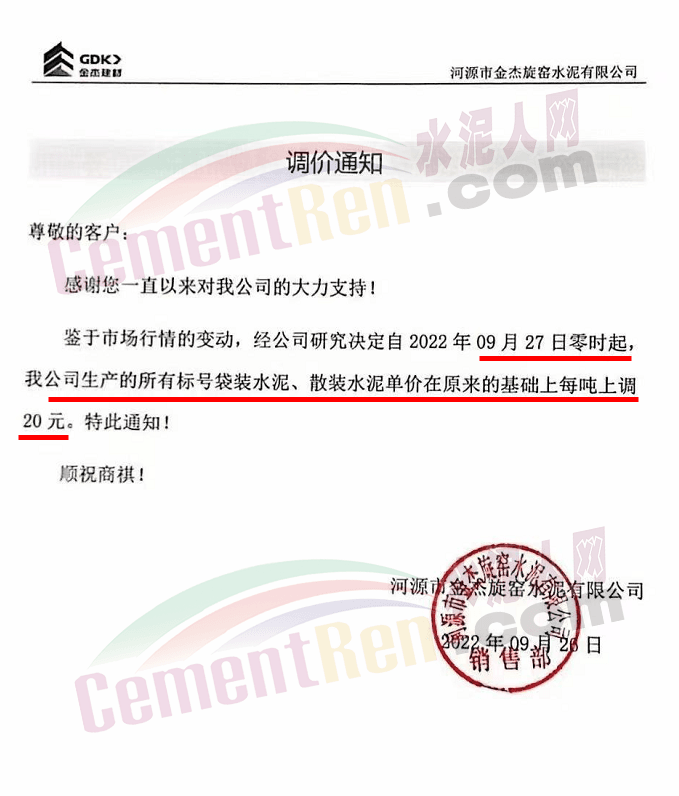 河源市金杰旋窯水泥有限公司通知鑒于市場行情的變動,經(jīng)公司研究決定自2022年09月27日零時起公司生產(chǎn)的所有標號袋裝水泥、散裝水泥單價在原來的基礎(chǔ)上每噸上調(diào)20元。