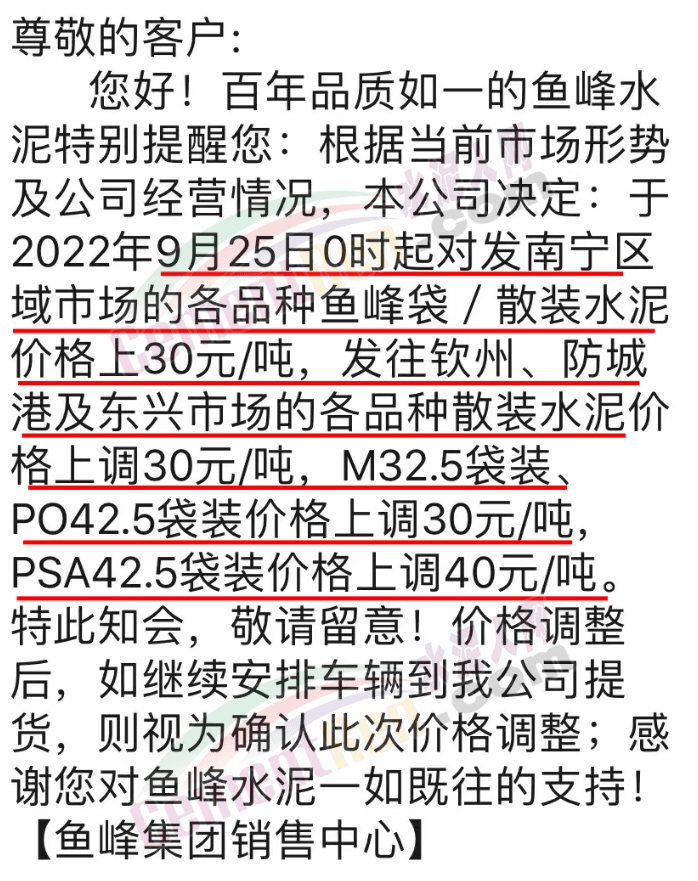 魚峰集團銷售中心通知,自9月25日0時起對發(fā)南寧及欽州、防城港及東興市場散裝水泥價格上調(diào)30-40元/噸。
