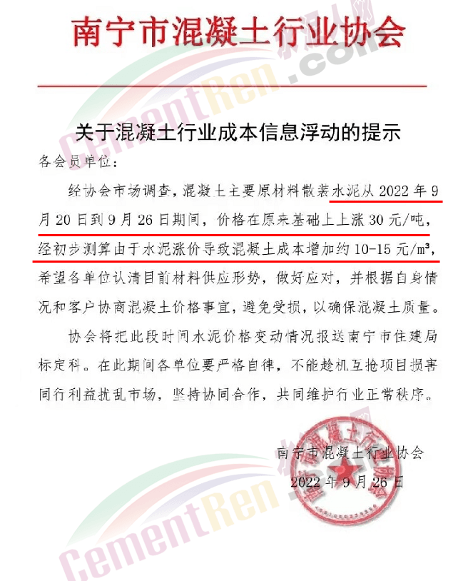 南寧市混凝土協(xié)會發(fā)提示函稱,水泥價格上漲30元/噸,混凝土成本增加約10-15元/立方,希望各單位做好應(yīng)對。
