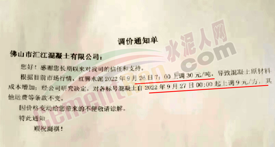 某混凝土企業(yè)通知,紅獅水泥9月26日7時上調(diào)30元/噸,企業(yè)對各標號混凝土同步上調(diào)9元/方。