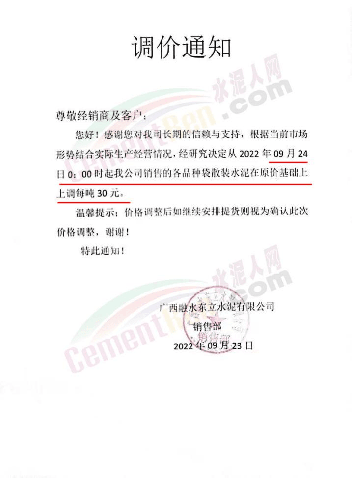 廣西融水東立水泥有限公司銷售部通知,自9月24日0時起,公司銷售的各品種水泥在原價基礎(chǔ)上上調(diào)30元/噸。