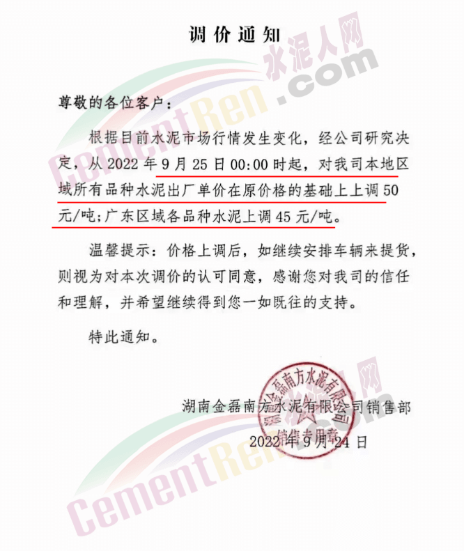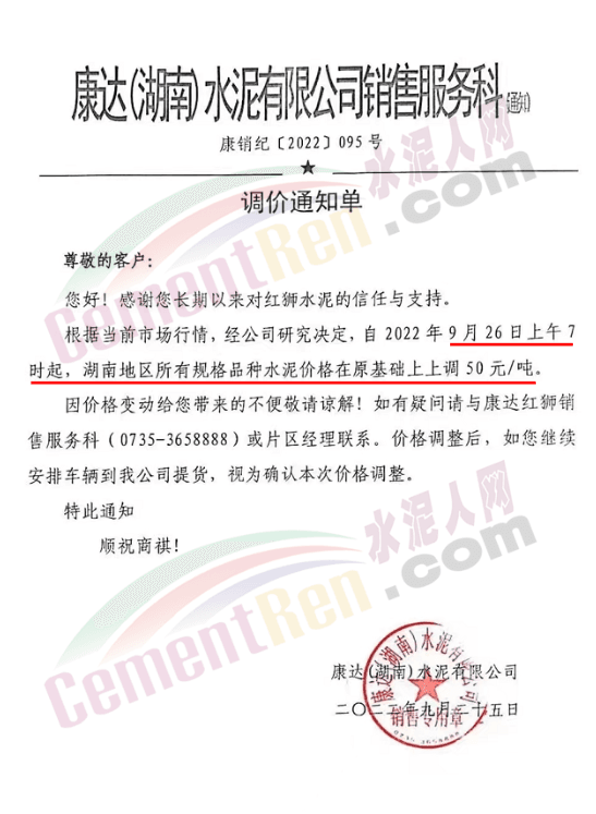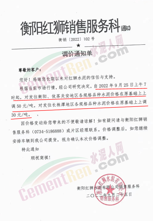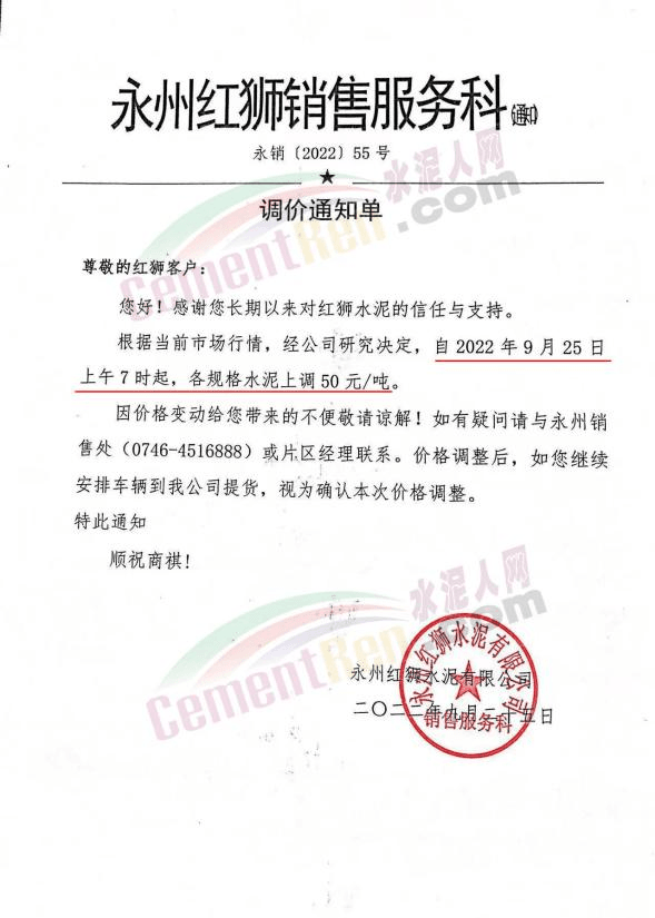 永州紅獅通知,9月25日上午7時起,各規(guī)格水泥上調(diào)50元/噸。