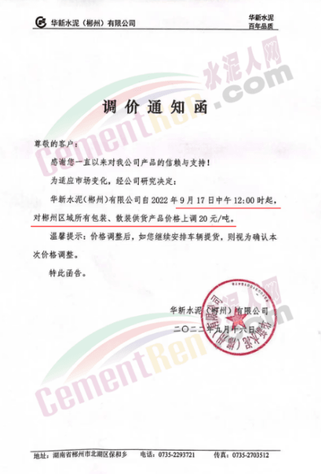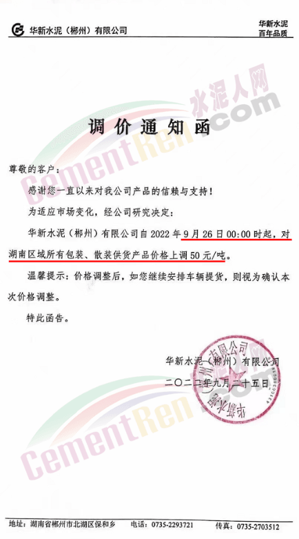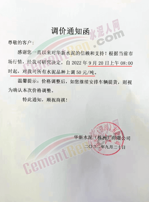 華新水泥(株洲)有限公司通知9月20日上午8時起,對公司所有水泥品牌上調(diào)50元/噸。