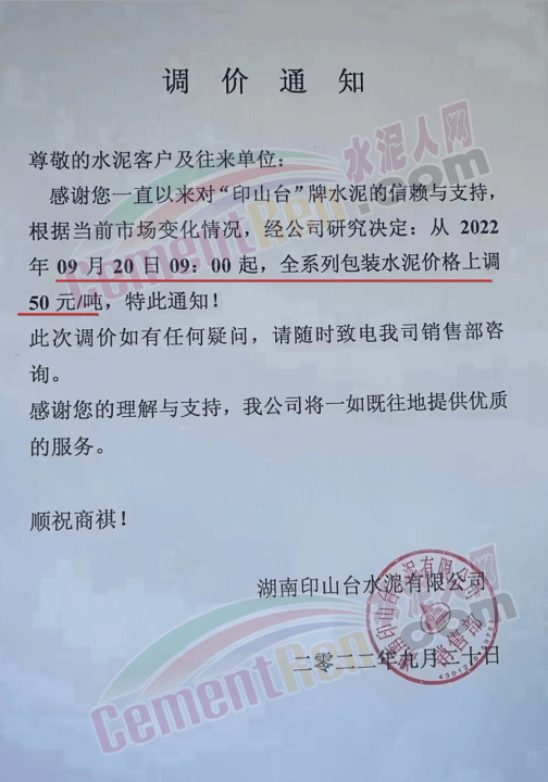 湖南印山臺水泥通知,9月20日9時起,全系列包裝水泥上調(diào)50元/噸。