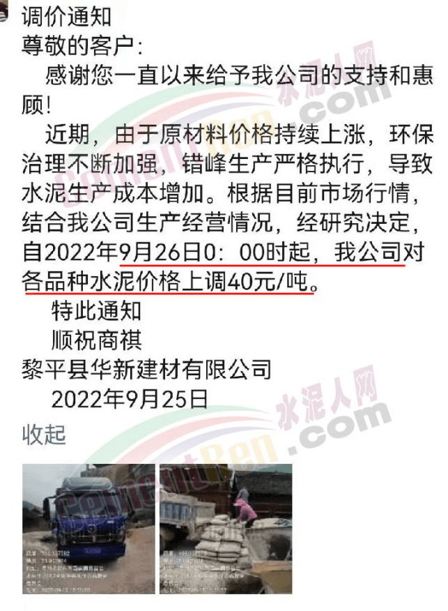 貴州省黔東南苗族侗族自治州黎平縣華新建材有限公司通知,由于原材料價格持續(xù)上漲,環(huán)保治理不斷加強,錯峰生產(chǎn)嚴格執(zhí)行,導(dǎo)致水泥生產(chǎn)成本增加。根據(jù)市場行情 ,自9月26日0時起,公司對各品種水泥價格上調(diào)40元/噸。