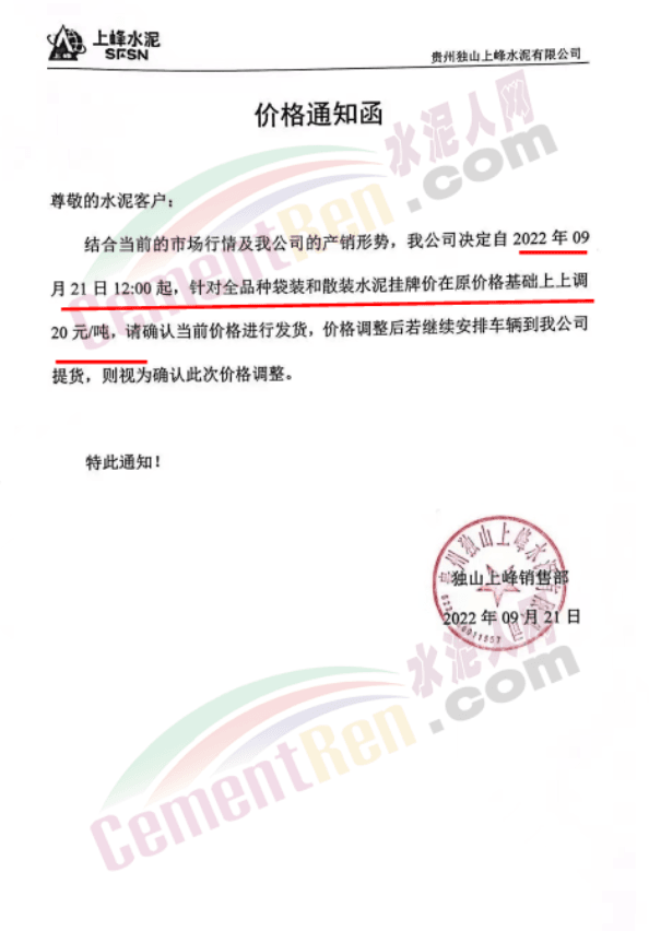 貴州獨山上峰水泥有限公司通知結(jié)合當前的市場行情及公司的產(chǎn)銷形勢,決定自2022年09月21日12:00起,針對全品種袋裝和散裝水泥掛牌價在原價格基礎(chǔ)上上調(diào)20元/噸。