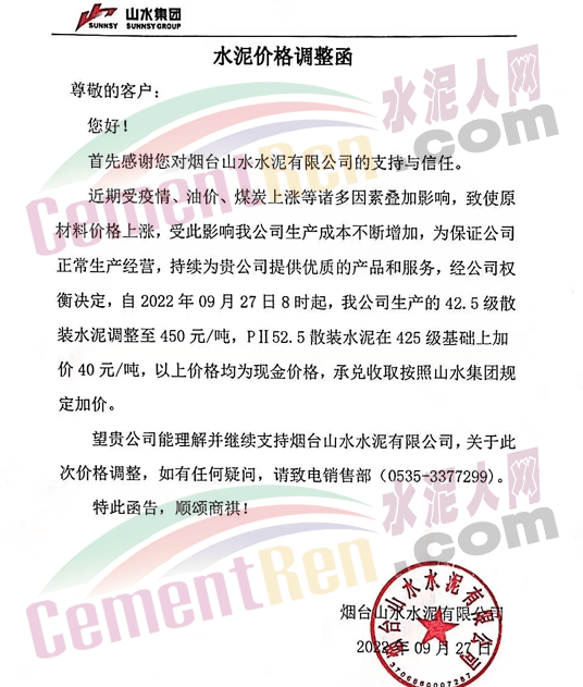 煙臺山水水泥有限公司發(fā)布通知稱:近期受疫情、油價、煤炭上漲等諸多因素疊加影響,致原材料價格上漲,受此影響,我公司生產(chǎn)成本不斷增加,為保證公司正常生產(chǎn)經(jīng)營,經(jīng)公司權(quán)衡決定,自2022年9月27日8時起,我公司生產(chǎn)的42.5級散裝水泥調(diào)至450元/噸,PII52.5散裝水泥在425級基礎(chǔ)上加價40元/噸。