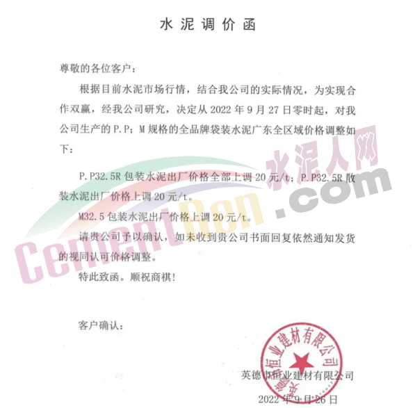 英德市恒業(yè)建材有限公司發(fā)布通知稱:自2022年9月27日零時起,我公司生產(chǎn)的P.P32.5R包裝水泥出廠價格上調(diào)20元/噸;P.P32.5R散裝水泥出廠價格上調(diào)20元/噸; M32.5包裝水泥出廠價格上調(diào)20元/噸。