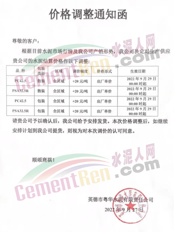 英德市粵華水泥有限責(zé)任公司發(fā)布通知稱,自2022年9月29日0:00起,PC42.5、PSA32.5R、PC42.5、PSA32.5R上調(diào)20元/噸。