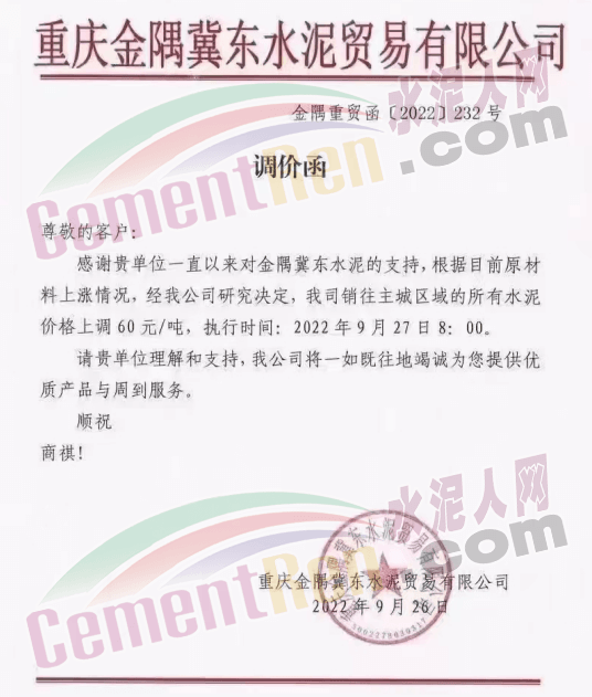 重慶金隅冀東水泥貿(mào)易有限公司發(fā)布通知稱:根據(jù)目前原材料上漲情況,自2022年9月27日8時起,我司銷往主城區(qū)的所有水泥價格上調(diào)60元/噸。