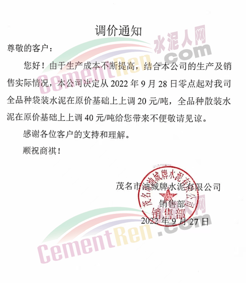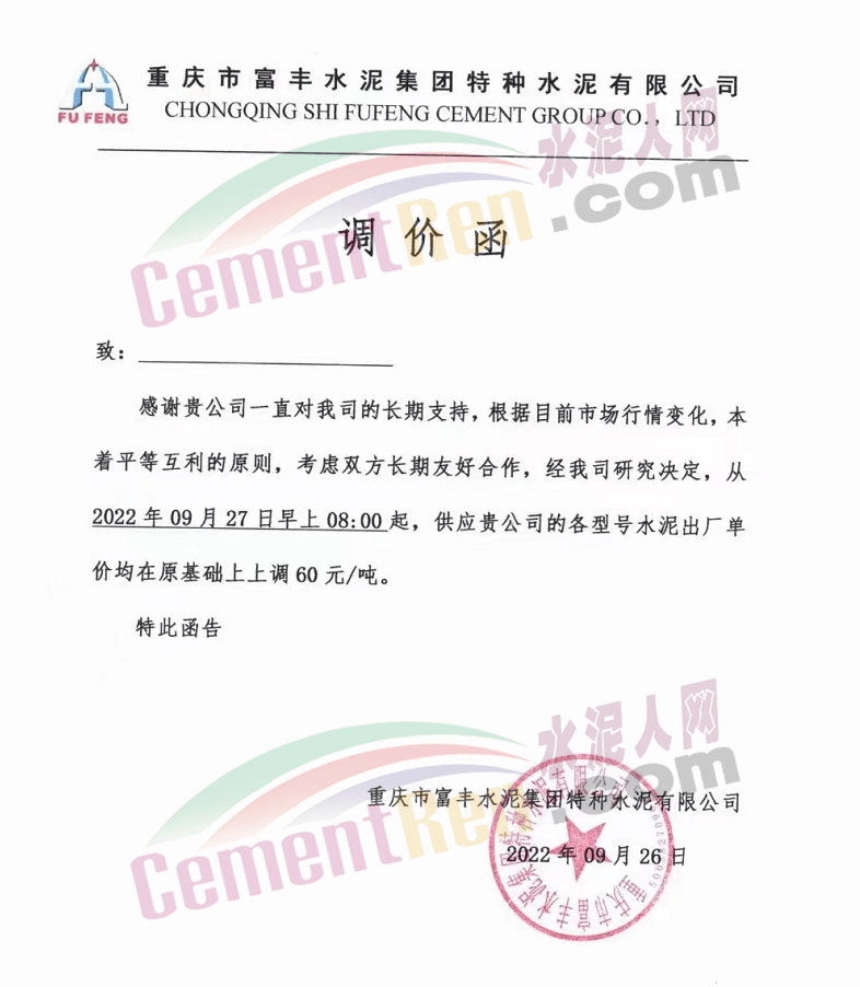 重慶市富豐水泥集團(tuán)特種水泥有限公司發(fā)布通知稱:根據(jù)目前市場行情變化,經(jīng)我司研究決定,從2022年9月27日早上8:00起,供應(yīng)貴公司各型號水泥出廠價格在原基礎(chǔ)上上調(diào)60元/噸。