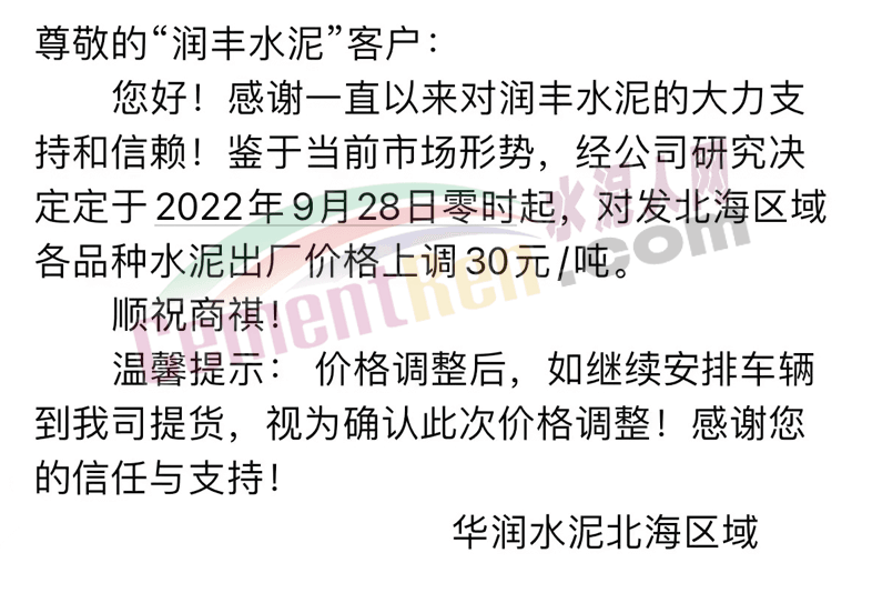華潤水泥北海區(qū)域發(fā)布通知稱:自2022年9月28日零時起,對發(fā)北海區(qū)域各品種水泥出廠價格上調(diào)30元/噸。