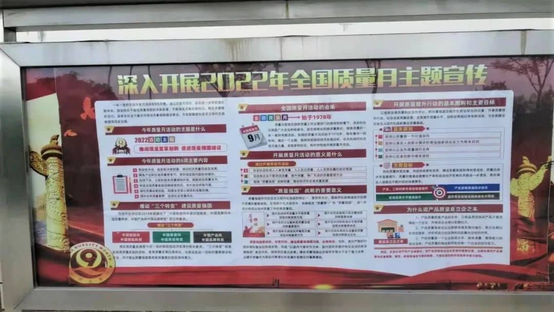 為加大“質(zhì)量月”的宣傳力度,營造濃厚的質(zhì)量月氛圍,區(qū)域所屬各公司充分利用電子屏、宣傳欄、宣傳海報等形式,在廠區(qū)重點區(qū)域懸掛橫幅,利用顯示屏循環(huán)播放質(zhì)量活動月相關(guān)宣傳視頻,生產(chǎn)現(xiàn)場設立宣傳展板,向職工發(fā)放宣傳資料,不斷加大宣傳力度,營造人人知曉的宣傳氛圍,全方位對職工進行覆蓋式質(zhì)量意識教育,為公司高質(zhì)量發(fā)展夯實基礎。