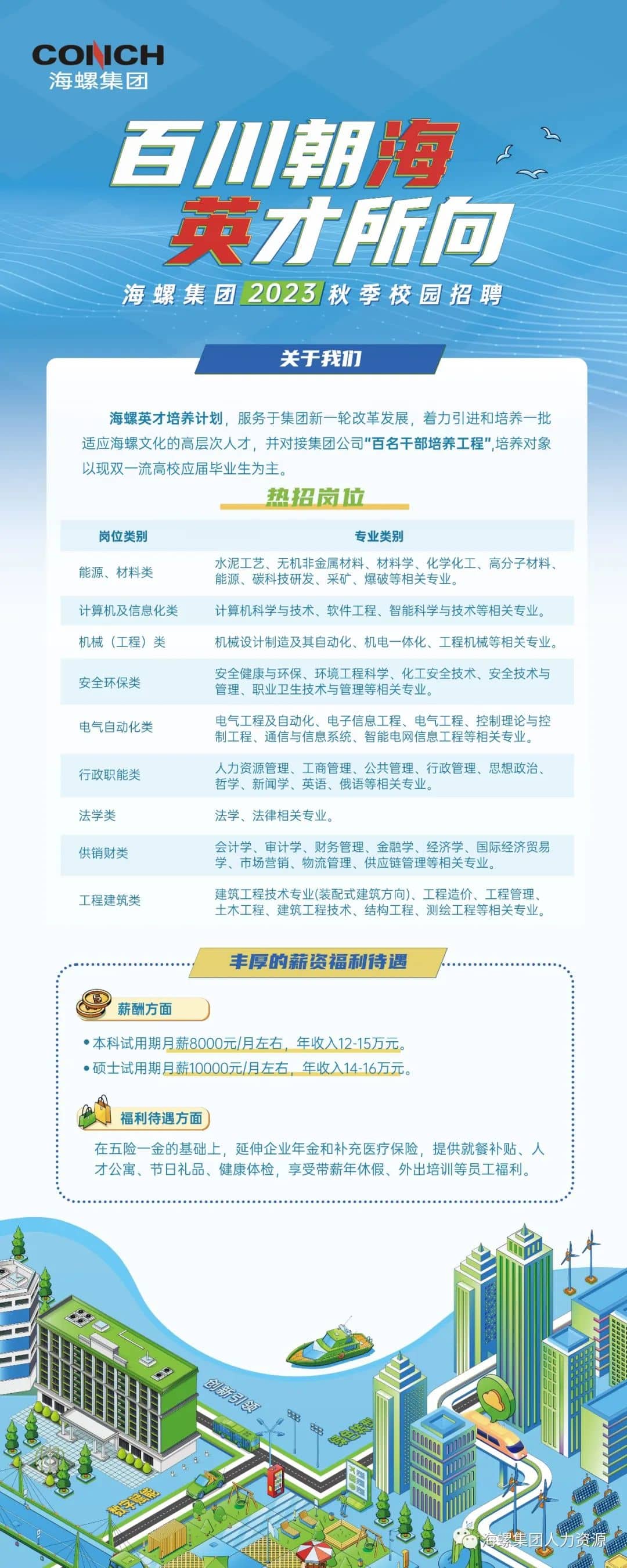 水泥人網(wǎng)注意到,2023年秋季校園招聘崗位的本科試用期月薪已上調(diào)至8000元/月左右,年收12-15萬元,碩士試用期月薪10000元/月左右,年收入14-16萬元。福利待遇五險一金的基礎(chǔ)上,延伸企業(yè)年金和補(bǔ)充醫(yī)療保險,提供就餐補(bǔ)貼、人才公寓、節(jié)日禮品、享受帶薪年休假、外出培訓(xùn)等員工福利。