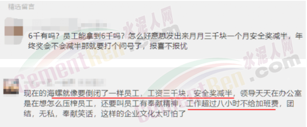 另據(jù)水泥人網(wǎng)通訊員消息,近來海螺水泥將員工安全獎減半,同時因績效評分下降,員工工資也基本降至原來的八折水平。且有通知稱,若企業(yè)出現(xiàn)虧損,年金也將取消。有網(wǎng)友留言說,“到手三千塊,一個月安全獎減半,年終獎會不會減半要打個問號了。”