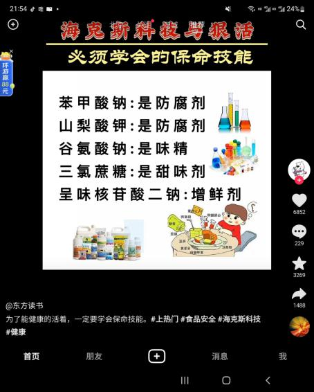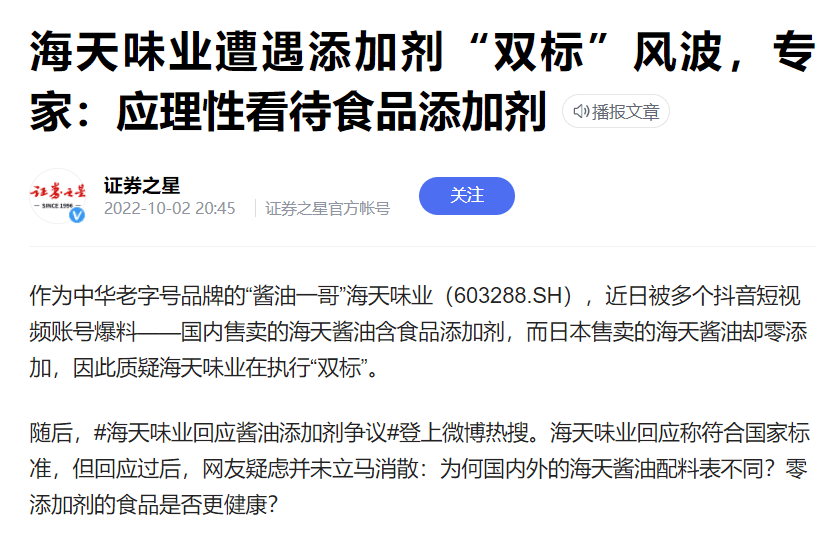 隨著“??怂箍萍?rdquo;視頻博主辛吉飛的持續(xù)爆料,越來(lái)越多的產(chǎn)品出現(xiàn)在觀眾眼前。辛吉飛拍了一個(gè)制作勾兌醬油的方法,雖然沒(méi)指名道姓,但大家還是聯(lián)想到了“醬油一哥”海天味業(yè)。此后,多個(gè)抖音短視頻賬號(hào)爆料——國(guó)內(nèi)售賣的海天醬油含食品添加劑,而日本售賣的海天醬油卻零添加,因此質(zhì)疑海天味業(yè)在執(zhí)行“雙標(biāo)”。