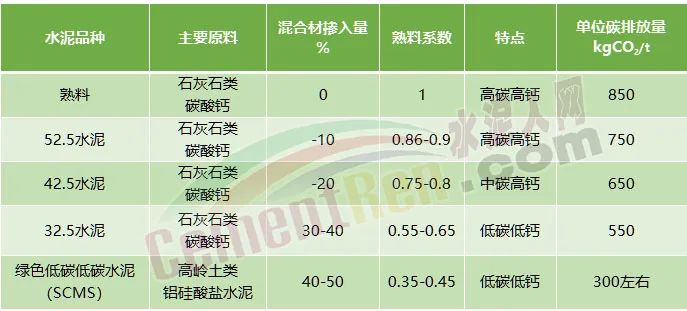 上述表格中列出的綠色低碳低鈣水泥,強(qiáng)度等級(jí)是32.5,特點(diǎn)是低碳低鈣低熟料系數(shù),國(guó)際上統(tǒng)稱為新型低碳膠凝材料Supplementary Cementitious Materials (SCMs),直譯為補(bǔ)充型水泥質(zhì)材料。