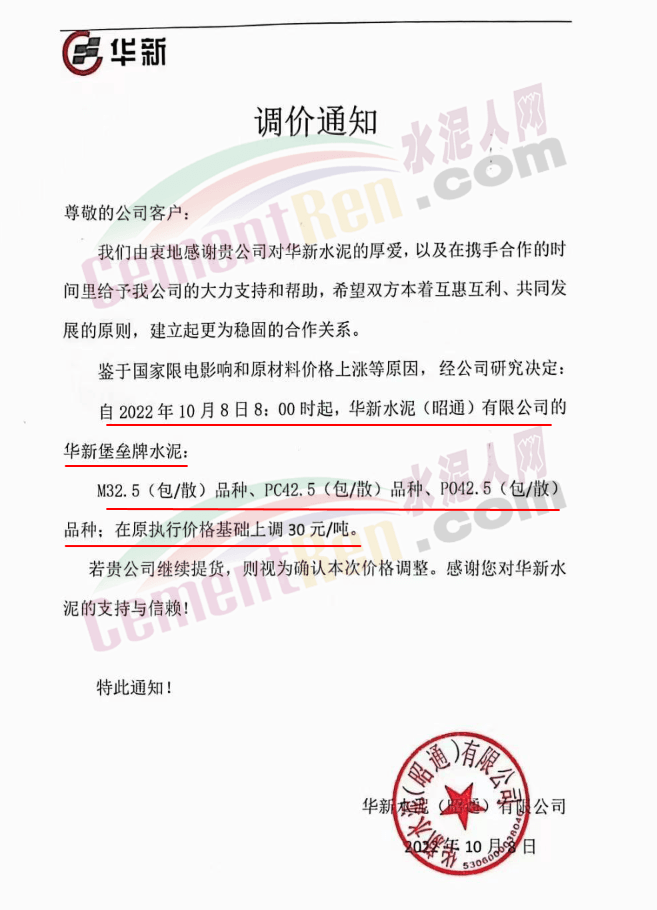 水泥人網(wǎng)通訊員消息,日前,華新水泥昭通公司通知,鑒于國家限電影響和原材料價格上漲等原因,經(jīng)公司研究決定自10月8日8時起,華新堡壘牌水泥在原執(zhí)行價格基礎上上調(diào)30元/噸。