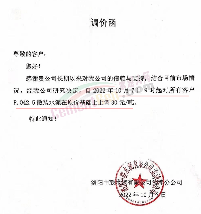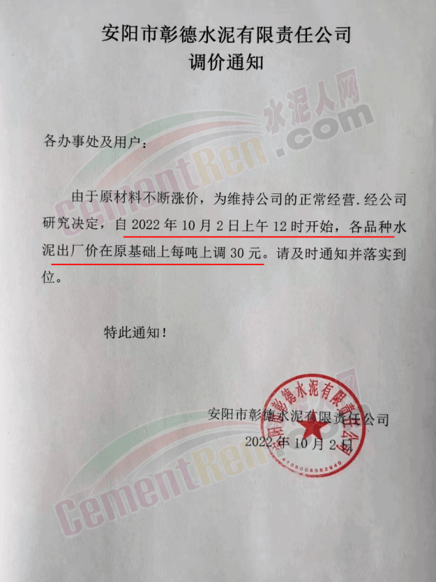 河南安陽彰德水泥有限責任公司通知由于原材料不斷漲價,為維持公司的正常經(jīng)營,經(jīng)公司研究決定,自10月2日上午12時起,各品種水泥出廠價上調(diào)30元/噸。